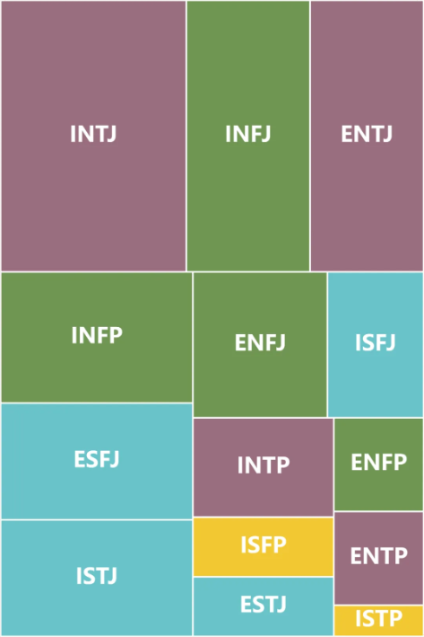 从中,一些有趣的事情出现了:INTJ的占比最高,而与之相反的ESTP居然一个都没有!N和J的组合很强,几乎占了一半!