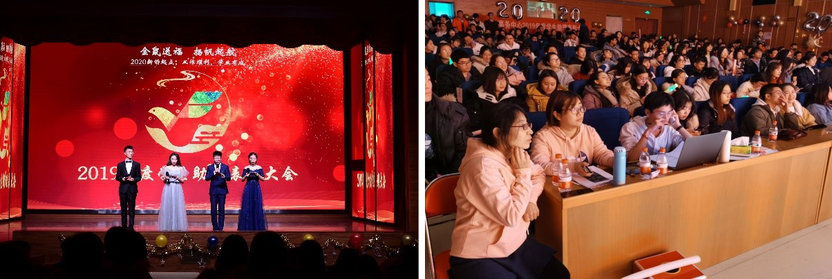 学生助理展现了工作之外多才多艺的一面:相声《考上大学后》以幽默风趣的方式讲述了大学生活的那些事,惹得大家开怀大笑;《小人舞》由京工飞鸿大家庭的新人“京京,工工,飞飞,鸿鸿,赞赞”表演,十几名同学高度的默契和熟练的技艺博得满堂喝彩;马晓宁老师的脱口秀《我的2019》从地球流浪聊到互联网裁员到严峻的就业形势到孩子到父母,大家在笑声中明白了道理;良舍的同学们带来的小品《良舍在你身边》,从生日时的一份小礼物到不舒服时的一份药品到卫生检查,让大家感受到良舍无微不至的温暖;李婷老师带领学生助管们表演的《野狼disco》,极具感染力,将整场大会的气氛引向高潮;扇子舞《左手指月》结合悠扬婉转的旋律,将坚硬的扇骨与柔美的绸缎结合在一起,表达出了娇而不媚,刚柔并济的中国古典美,卡务中心同学们演唱的《成都》,表达的感情纯正,是人内心最真实的感受,引起全场观众的共鸣……