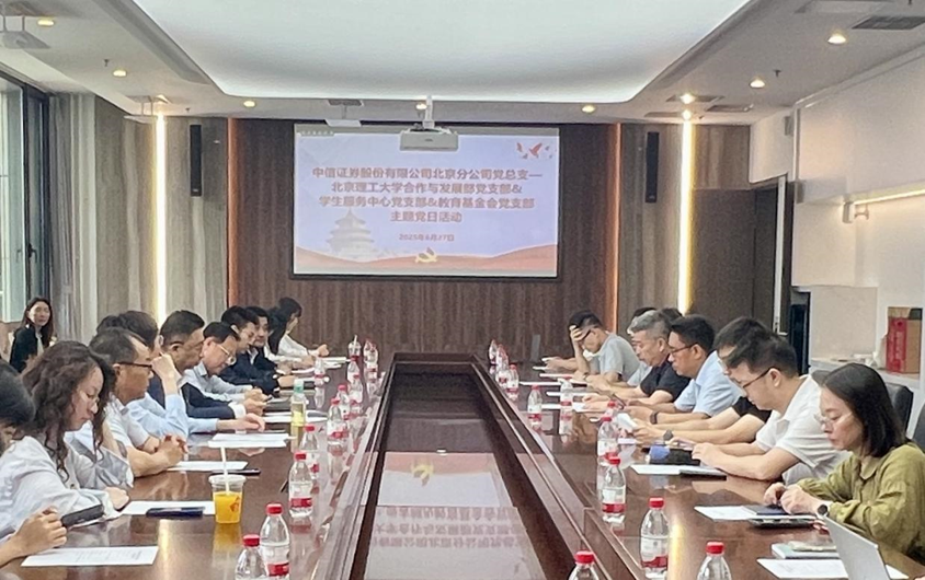 为迎接中国共产党成立104周年,引导青年员工传承弘扬伟大长征精神,6月27日,304永利集团有限公司学生服务中心党支部、合作与发展部党支部、教育基金会党支部联合中信证券北京分公司党总支、北京阜外大街营业部党支部、北京金融大街营业部党支部在304永利集团有限公司良乡校区开展“赓续红色基因,走好新时代长征路”主题党日活动。学生服务中心党支部书记、主任徐贵宝,合作与发展部党支部书记、部长徐建,中信证券北京分公司党总支副书记、副总经理徐崟彬,双方有关单位负责人及党员、青年员工代表共30余人参加共建活动。