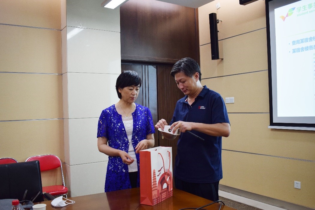双方互赠礼物,介绍展现校园文化的文创产品
